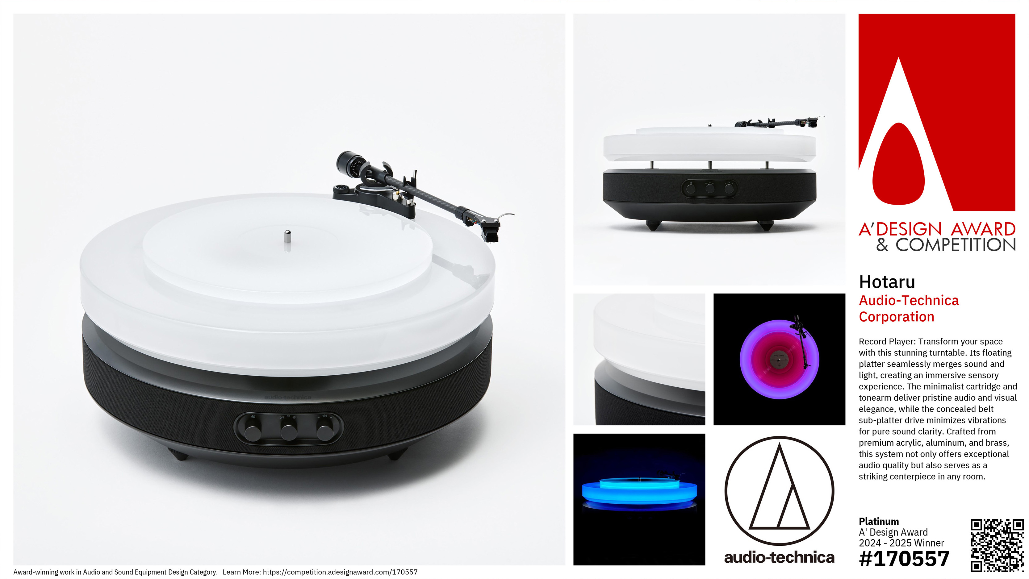 鐵三角有限公司(總部位於日本東京都町田市,社長:松下和雄先生)欣然宣布,其於米蘭設計週中首次亮相的唱盤「Hotaru」,榮獲 2025 年「A' Design Award & Competition」產品設計類別的榮譽——「白金獎(Platinum Award)」。頒獎典禮於2025年 7 月 17 日,在義大利科莫湖舉行。