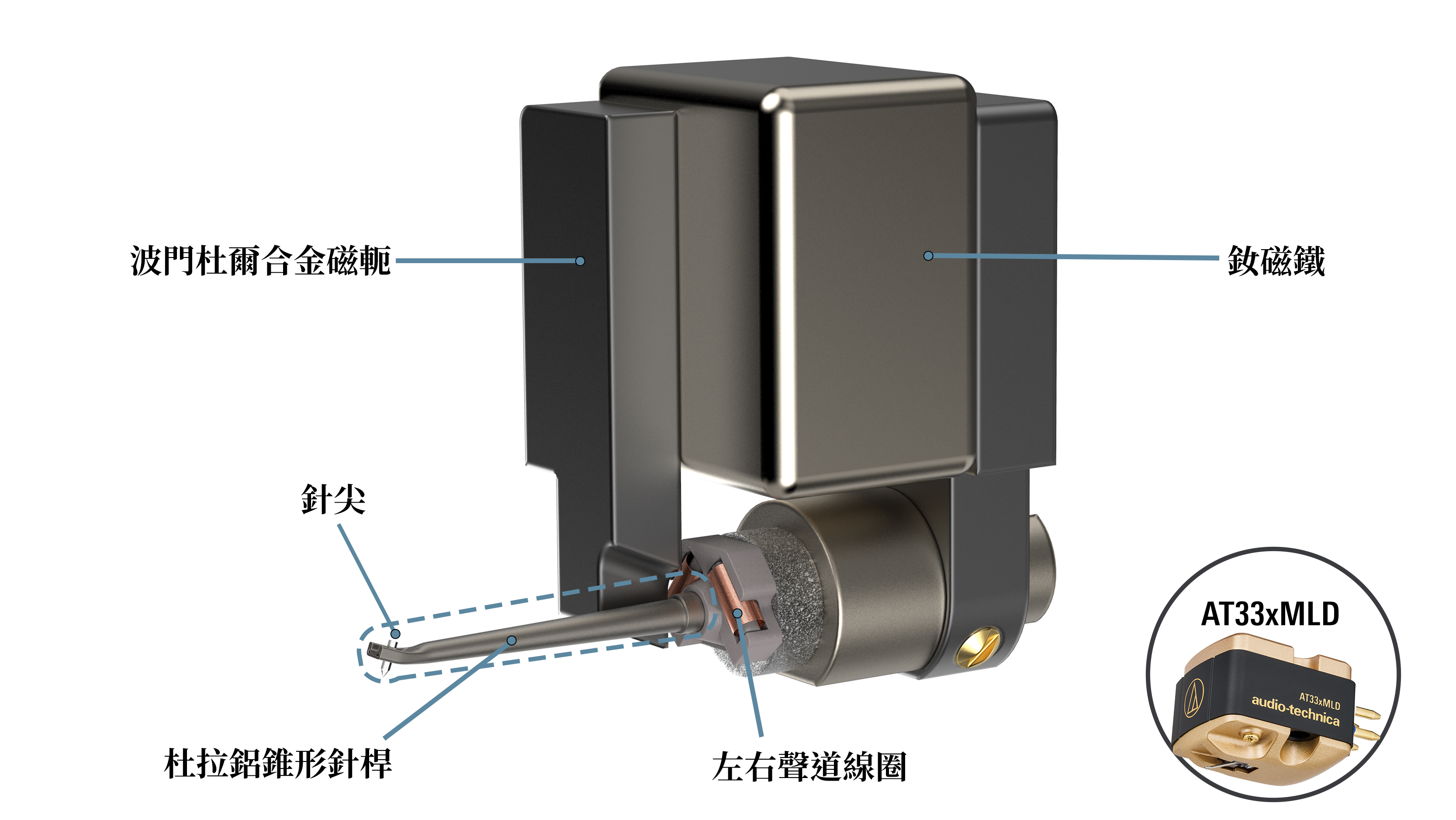 AT33xMLD 採用高硬度杜拉鋁管狀針桿,前端加工為錐形結構,朝針尖逐漸收窄,展現杜拉鋁獨特的音質特性,並強化高頻控制與瞬時響應能力。針桿結合穩固的懸吊結構,有效降低動態柔順度,提升唱針的追蹤穩定性。針桿支點處配置兩組獨立的 PCOCC 線圈,確保左右聲道訊號傳輸純淨且準確。
