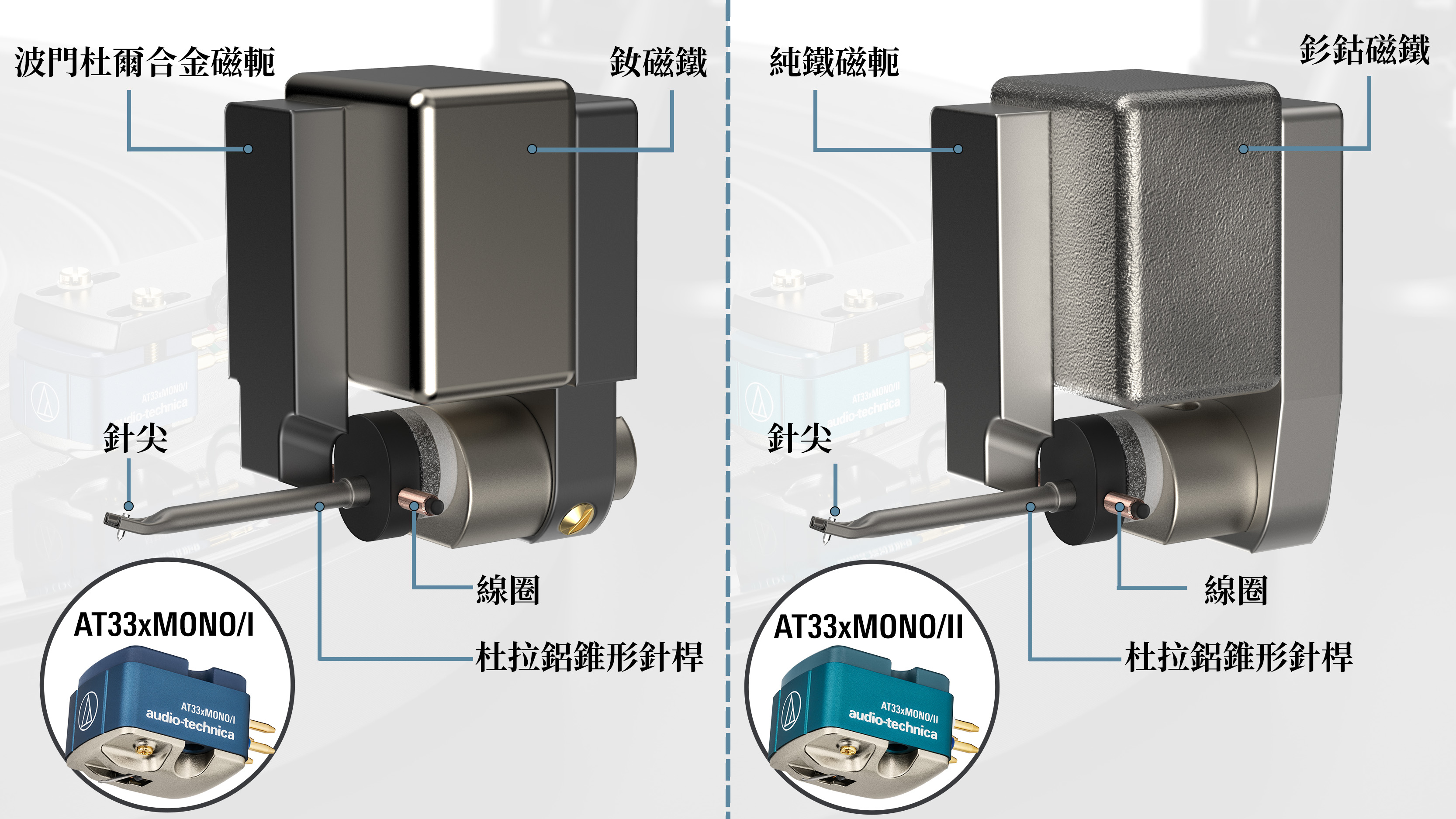 AT33xMONO/I 與 AT33xMONO/II 皆採用 TRUE MONO 結構,僅針對水平方向的訊號產生發電反應,能有效避免垂直方向的雜訊干擾,提供純淨、穩定的單聲道重播體驗。