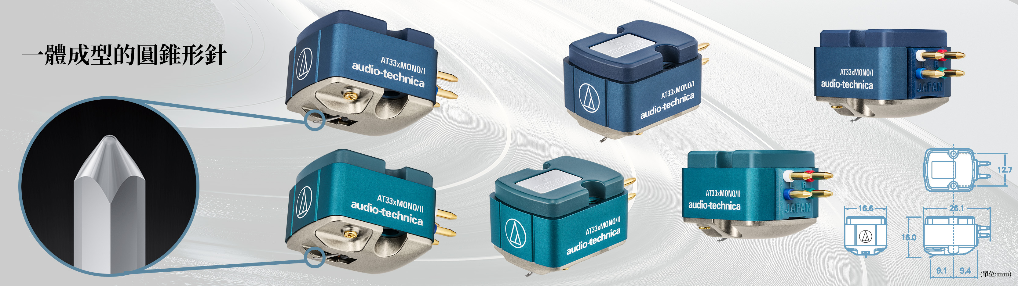 AT33xMONO/I 與 AT33xMONO/II 均採用一體成型的圓錐形針尖,針尖外形專為單聲道唱片的音槽結構所設計,能準確對應寬度與深度的音槽結構。此設計有助於提升中低頻的能量感,並進一步強化整體聲音的穩定性。