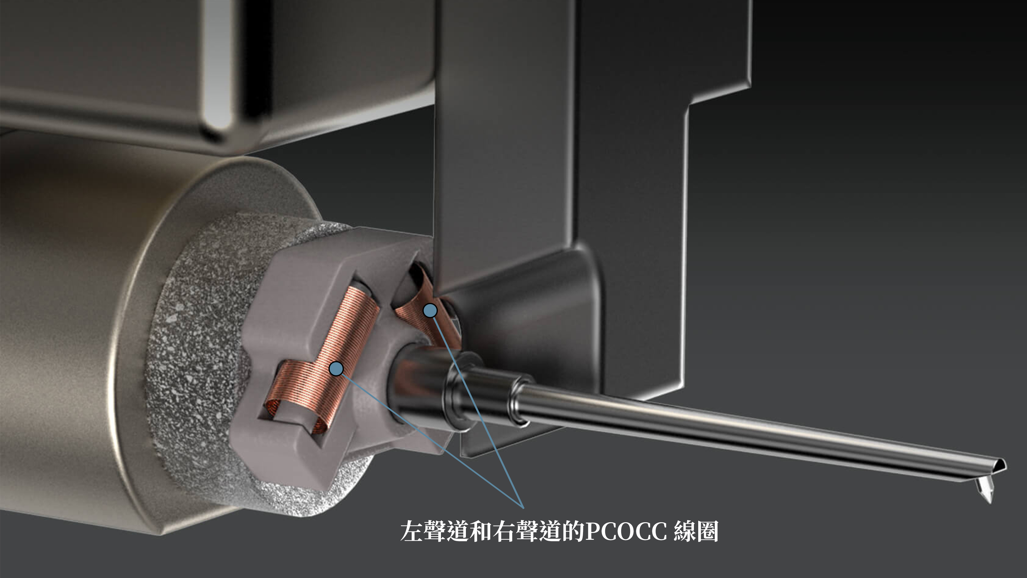 支點處配置 PCOCC線圈,與「真單聲道」結構整合,能更直接地感應水平方向的訊號變化,實現低失真、高解析度的單聲道音訊傳輸。