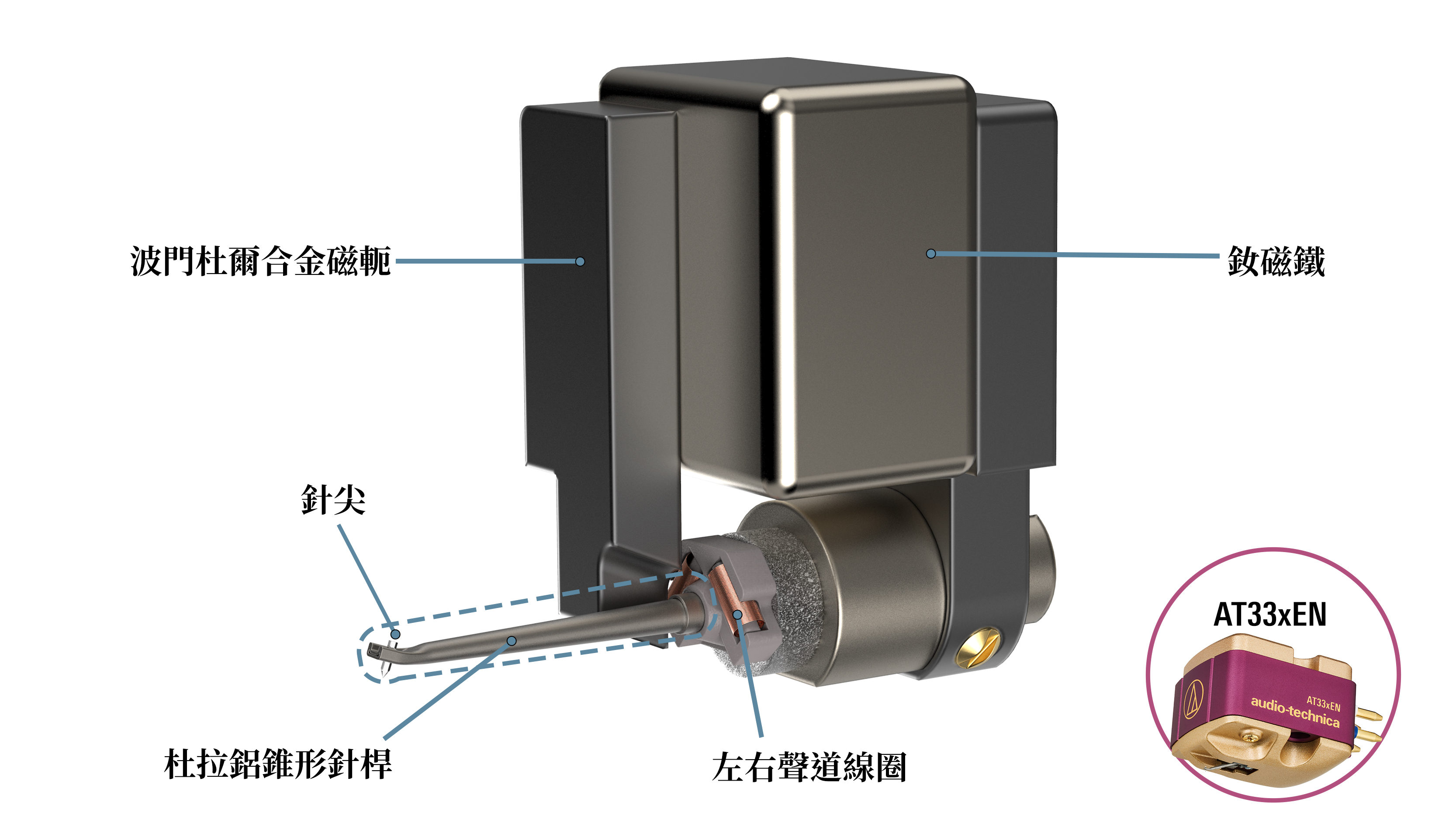 AT33xEN 採用高硬度杜拉鋁管狀針桿,前端加工為錐形結構,朝針尖逐漸收窄,展現杜拉鋁獨特的音質特性,並強化高頻控制與瞬時響應能力。針桿結合穩固的懸吊結構,有效降低動態柔順度,提升唱針的追蹤穩定性。針桿支點處配置兩組獨立的 PCOCC 線圈,確保左右聲道訊號傳輸純淨且準確。