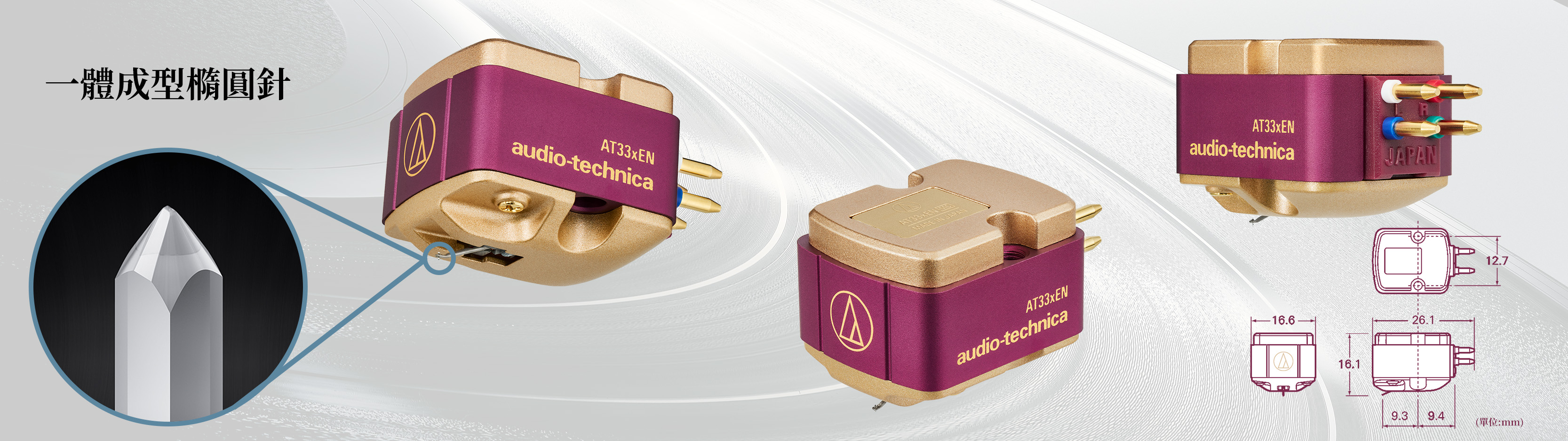 AT33xEN 採用輕量化的一體成型橢圓針,有效提升針尖的基礎性能,在寬廣頻率範圍內提供穩定且低失真的聲音表現。