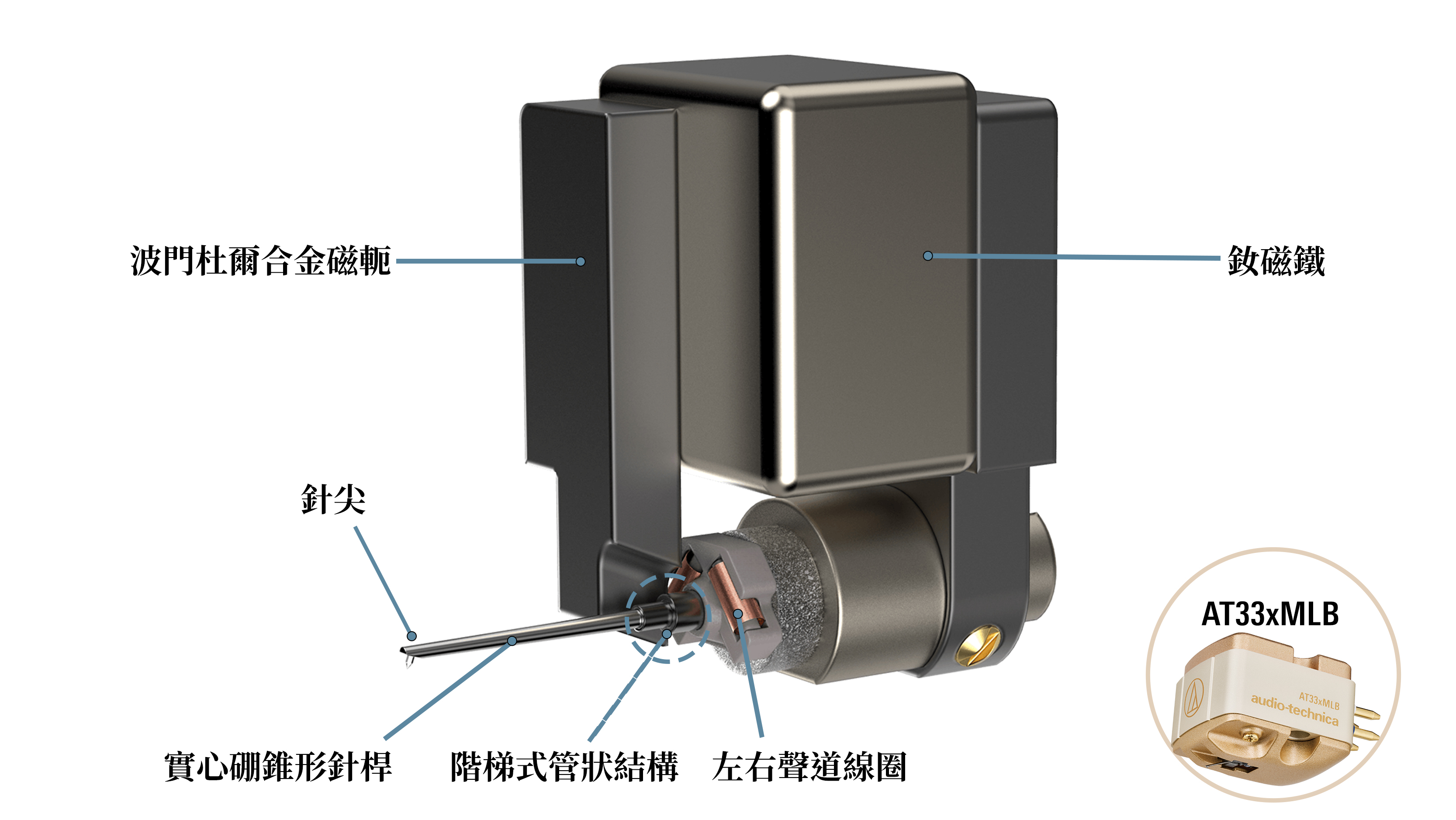 AT33xMLB 採用實心硼材質的錐形針桿,前端逐漸收細並連接微線型針尖,有助於提升高頻響應與傳遞效率。硼具備優良的振動傳導特性,搭配輕量化的針尖設計,進一步強化高頻播放表現,呈現細膩而豐富的音色。